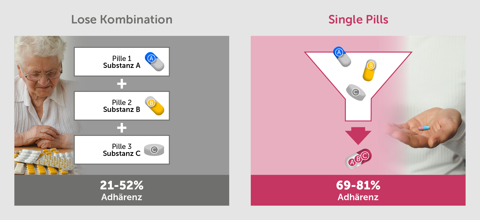 Single Pill-Präparate vereinfachen das Therapieschema und senken die Tablettenlast, indem sie mehrere Wirkstoffe in einer Darreichungsform kombinieren: