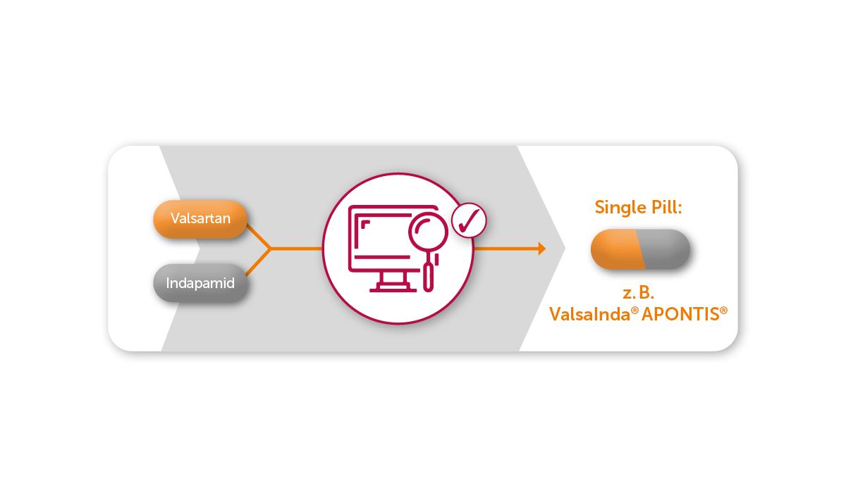 Jetzt die Therapie Ihrer Patient:innen mit Valsartan+Indapamid vereinfachen und die lose Kombination zu ValsaInda® APONTIS® zusammenfassen. Nutzen Sie die Chance auf eine höhere Adhärenz2 und Wirksamkeit2 Ihrer Therapieentscheidung durch den Single Pill Einsatz!
