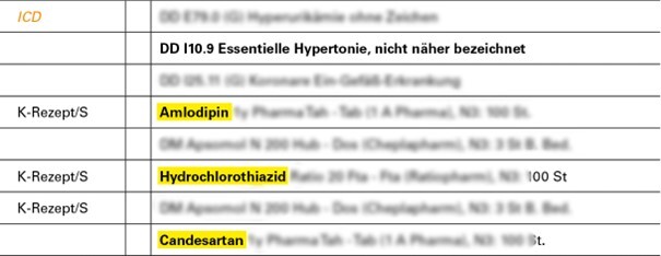 Mit Ihrer Praxis-EDV können Sie sehr schnell und einfach Ihre Dauertherapie-Patient:innen identifizieren, die noch auf eine lose Kombination aus Candesartan, Amlodipin und Hydrochlorothiazid eingestellt sind.