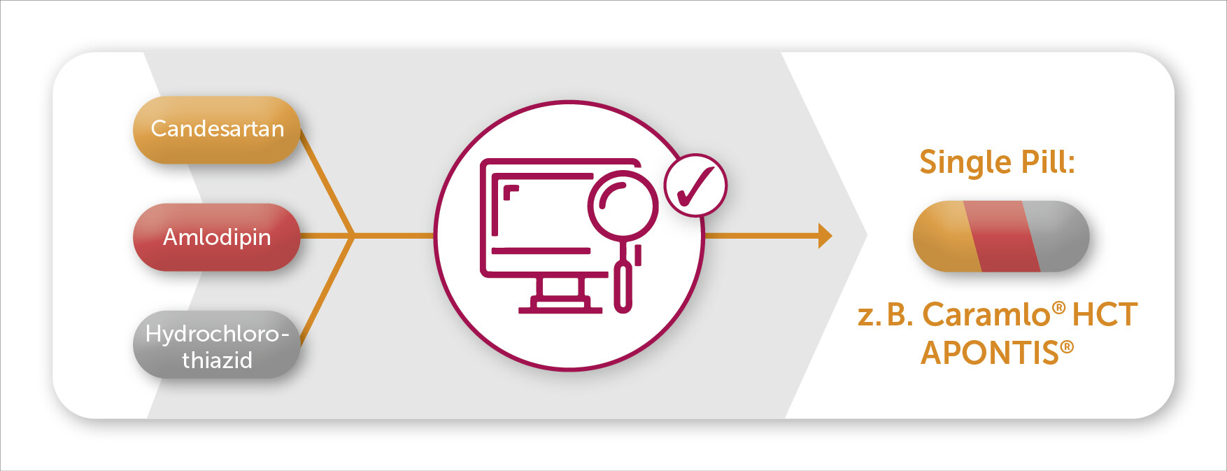 Caramlo® HCT APONTIS® bietet Ihnen die Möglichkeit, Ihre patient:innenindividuelle Therapieentscheidung für die Substanzkombination Candesartan + Amlodipin + Hydrochlorothiazid als Single Pill-Therapie fortzuführen.