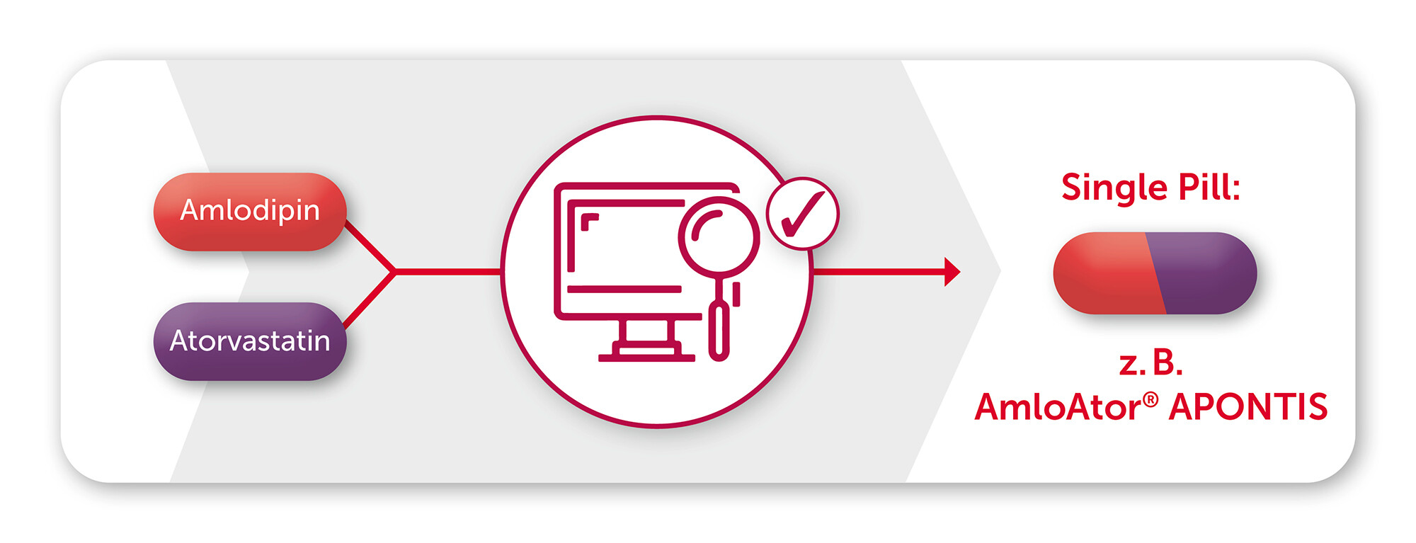 AmloAtor® APONTIS bietet Ihnen die Möglichkeit, Ihre patient:innenindividuelle Therapieentscheidung für die Substanzkombination Amlodipin + Atorvastatin als Single Pill-Therapie fortzuführen.