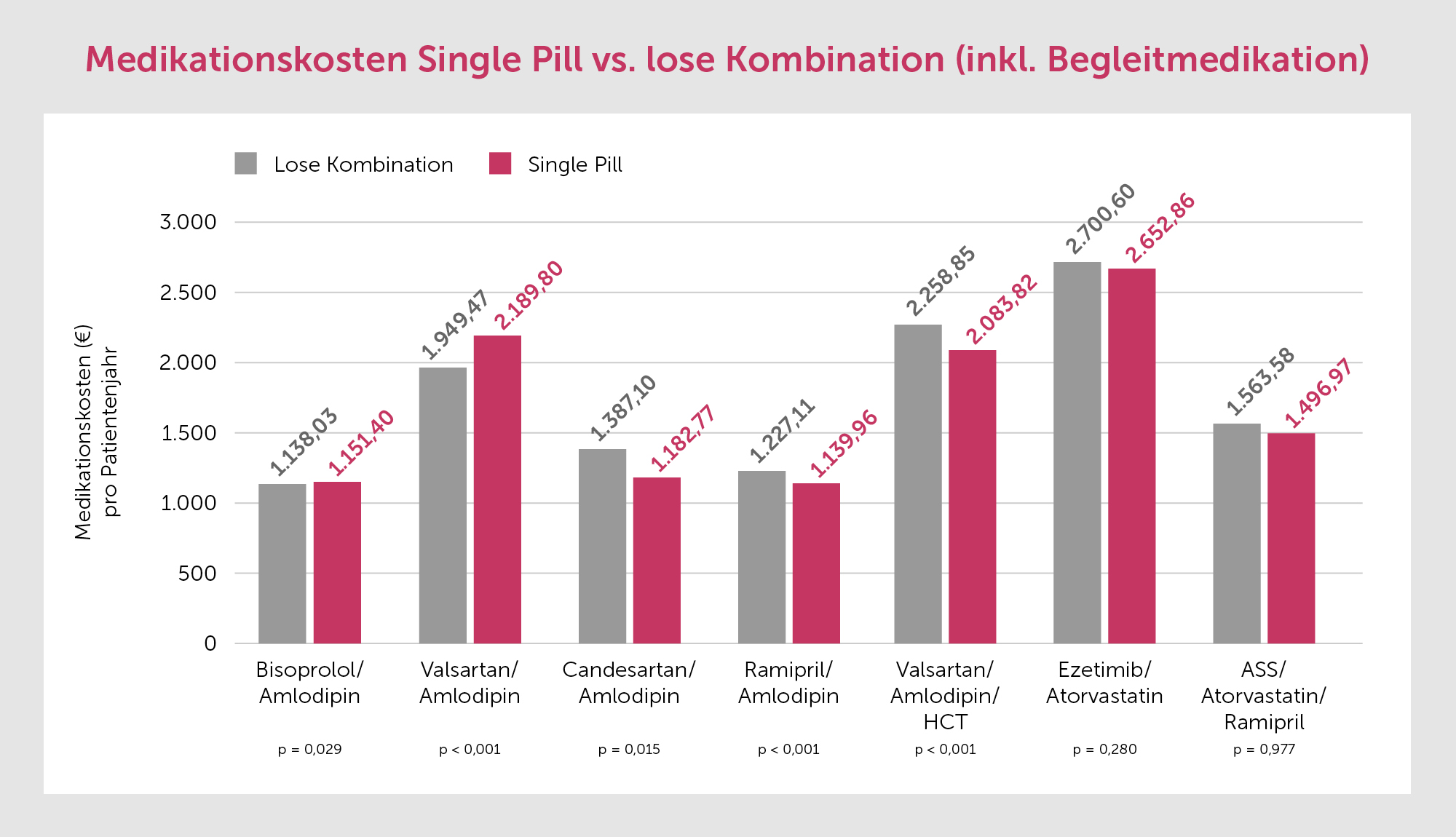 - Bei fünf der sieben untersuchten Wirkstoffkombinationen waren die entstandenen Medikationskosten innerhalb eines Jahres bei einer Single Pill signifikant niedriger als bei einer Verordnung derselben Wirkstoffe in loser Kombination (s. Abb.).1